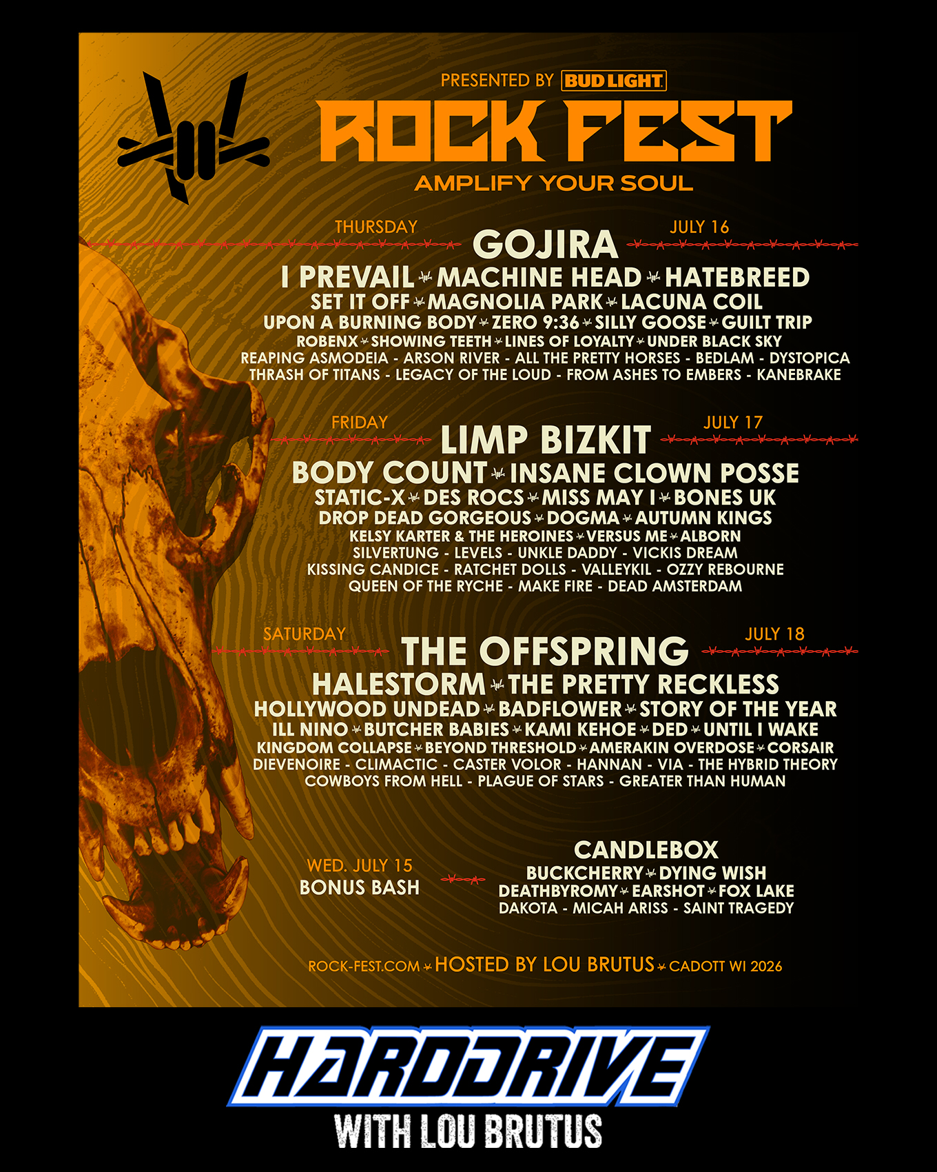 Everyone at HardDrive Radio is pumped for the 2026 edition of ROCK FEST in Cadott WI! It runs July 16, 17 and 18, with a Bonus Bash show on the 15th. Our own Lou Brutus returns as host of a lineup that’s crammed with amazing artists! The list includes The Offspring, Limp Bizkit, Gojira, Halestorm, The Pretty Reckless, Hollywood Undead, I Prevail, Machine Head, Set It Off, Static-X, Body Count, Insane Clown Posse, Lacuna Coil, Badflower, Autumn Kings, Story of the Year, Magnolia Park, Upon A Burning Body, Ded, Zero 9:36, Des Rocs, Miss May I, Bones UK, Ill Nino, Butcher Babies, Until I Wake, and tons of others. The Bonus Bash night will feature Candlebox, Buckcherry, Dying Wish, and more. Lou will be backstage interviewing the bands, onstage hosting the music, and in the pit capturing photos and video. Plus, he will be doing a special meet and greet, too! Hit https://rock-fest.com for info. See you there!