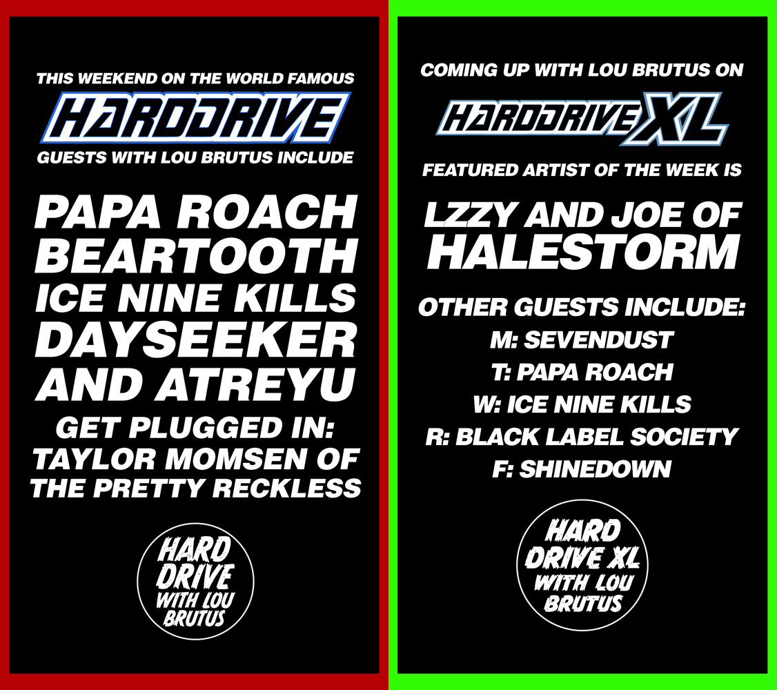 Then for the week of Monday March 23, Lzzy Hale and Joe Hottinger of Halestorm will join us each night as Featured Artist of the Week on HardDrive XL. Our other Special Guests will include Sevendust, Papa Roach, Ice Nine Kills, Black Label Society, and Shinedown.